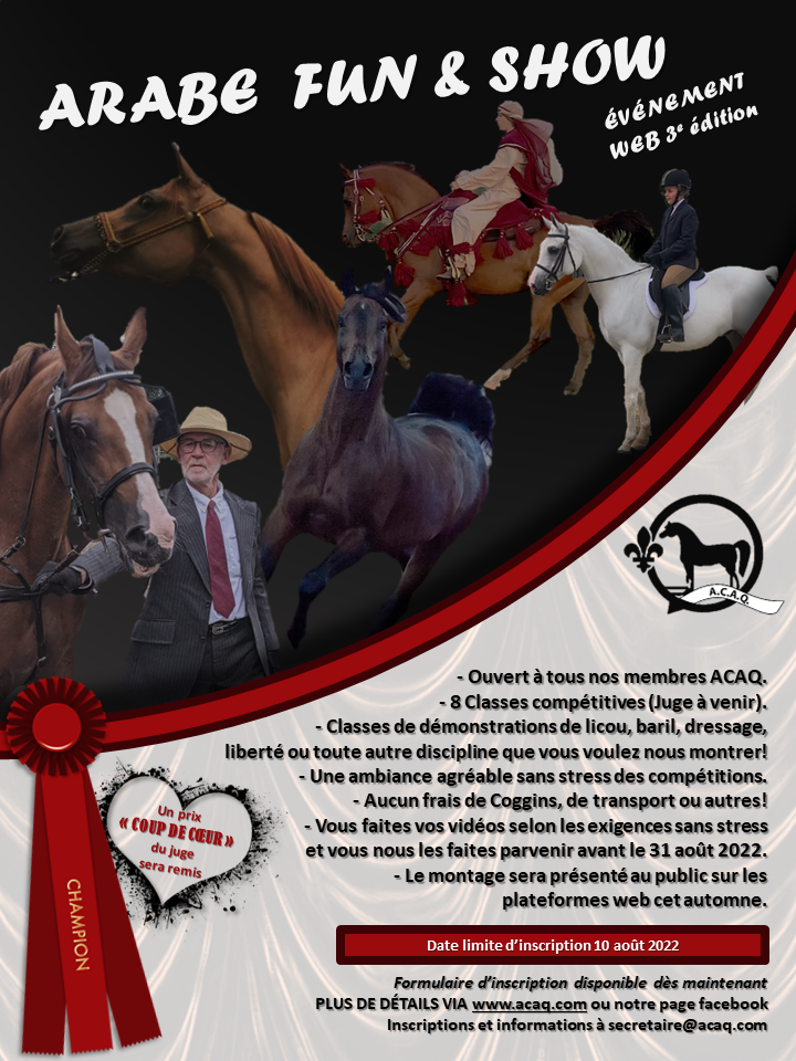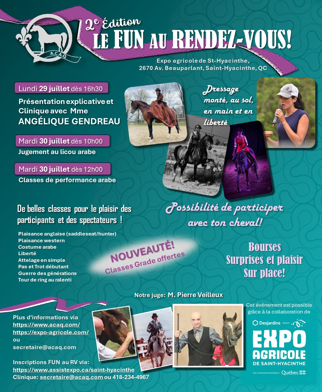L’association du cheval Arabe du Québec est heureuse de vous annoncer la 2e édition du Fun au Rendez-Vous qui aura lieu à Expo agricole de St-Hyacinthe. Il est possible de s’inscrire dès maintenant via