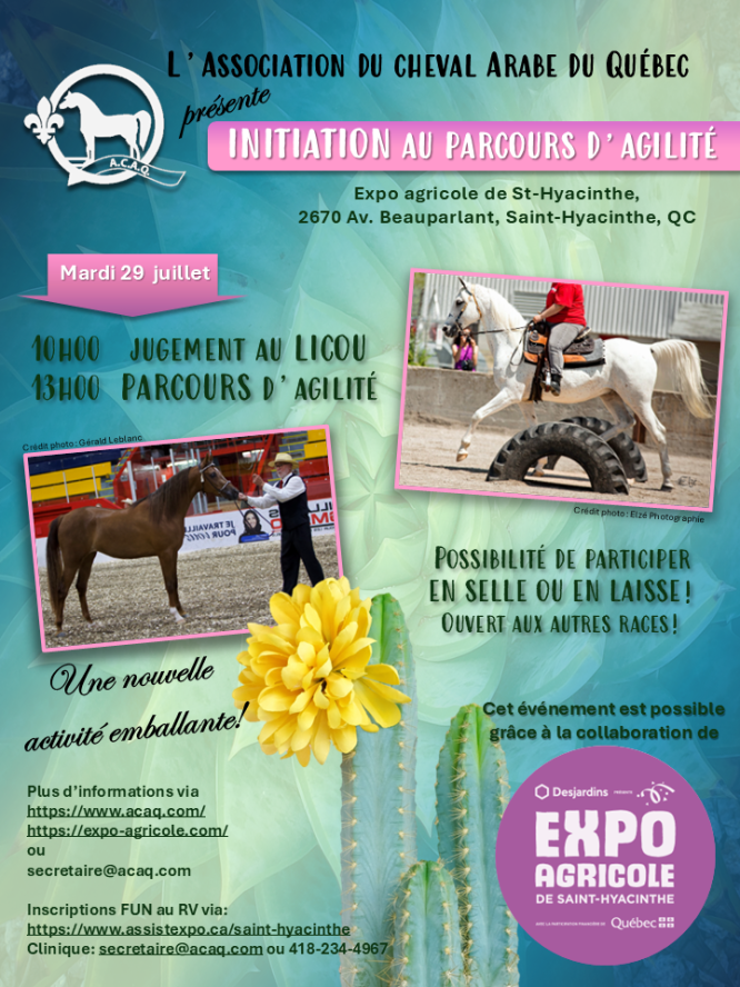 L’association du cheval Arabe du Québec est heureuse de vous annoncer la nouvelle activité "Initiation au parcours d'agilité" qui aura lieu à Expo agricole de St-Hyacinthe.