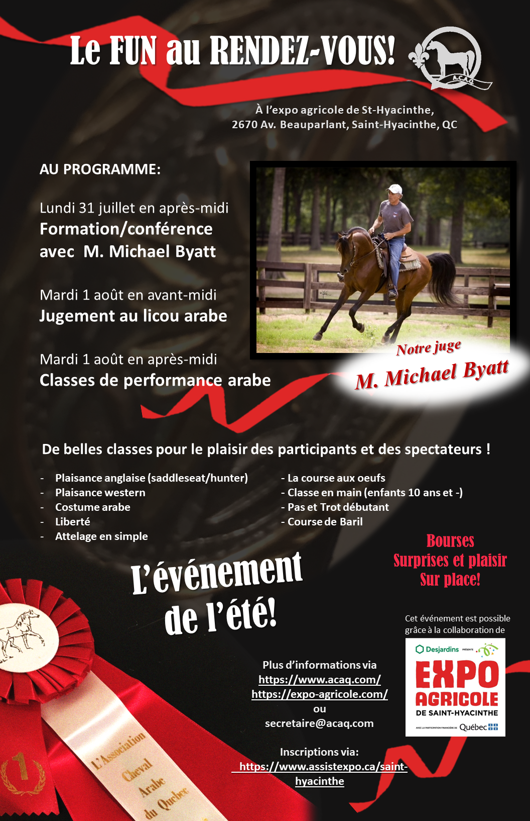 Le juge pour l’événement est M. Michael Byatt, une sommité reconnue comme entraineur, juge et éleveur de chevaux de niveau international. M. Byatt a généreusement accepté de donner une clinique/formation le lundi 31 juillet en journée et cette activité sera du jamais vu au Québec.