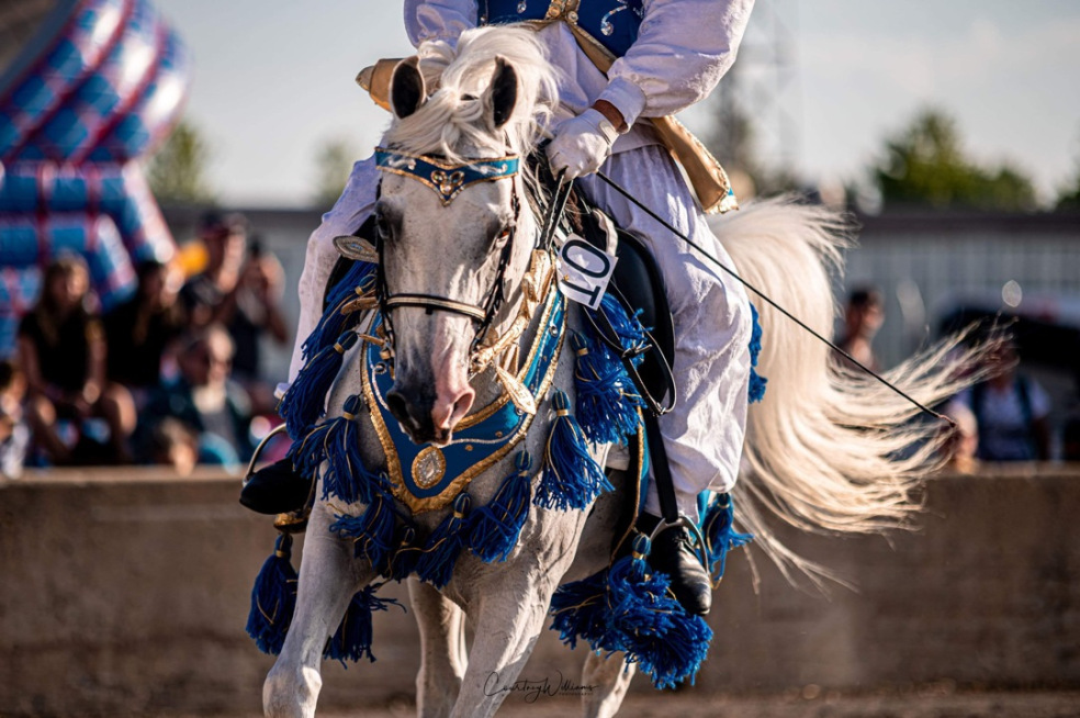 Équipement L'animal doit aussi accepter le costume et tous les apparats qui peuvent apeurer les jeunes montures débutantes. La classe est ouverte aux chevaux pur-sang et demi-sang arabe. Le costume en lui-même vaut pour 25% de la note attribuée par le juge. Il est noté par rapport à sa beauté et son originalité. Peu de règlements régissent sa confection, ce qui laisse place à l’imagination et à l’originalité. Sans faire partie des règlements officiels, on retrouve toujours une régularité dans les costumes soit une couverture couvrant le cheval en partie ou jusqu’aux fesses. La base de celle-ci est couverte de franges ou de glands de laine. Une bricole décorée est permise et est ornée des mêmes franges ou glands pour créer une continuité. Le seul réel critère pour le costume est que des décorations s’inspirant des insignes colorés du désert doivent orner le harnachement. Au niveau de la têtière, le mors, le hackamore ou toute autre têtière appropriée sont permises. Quant à elle, la selle avec étriers est obligatoire; elle peut être de type western ou classique et est habituellement cachée sous un cache-selle. Le harnachement et l’habillement doivent avant tout être tout à fait sécuritaires. |